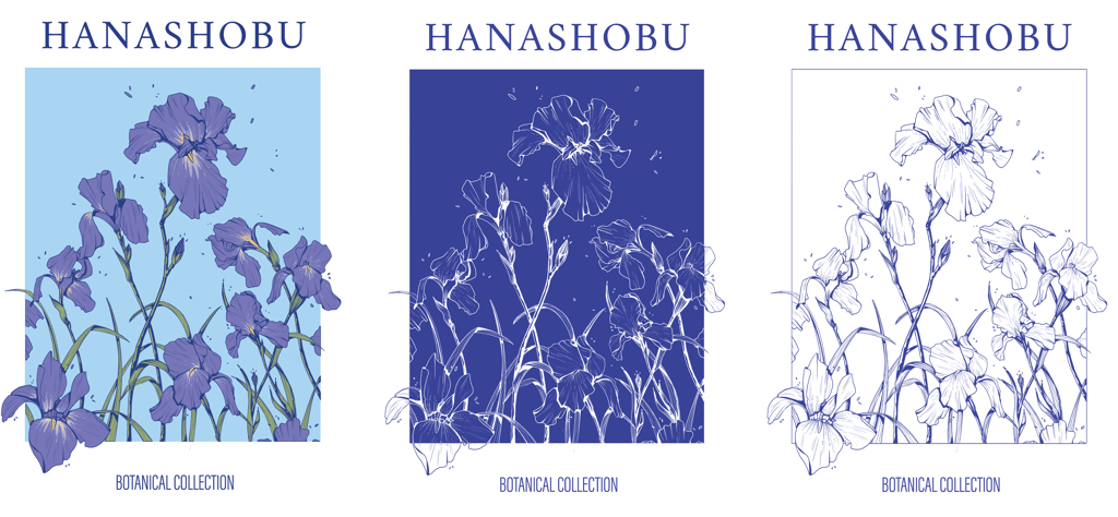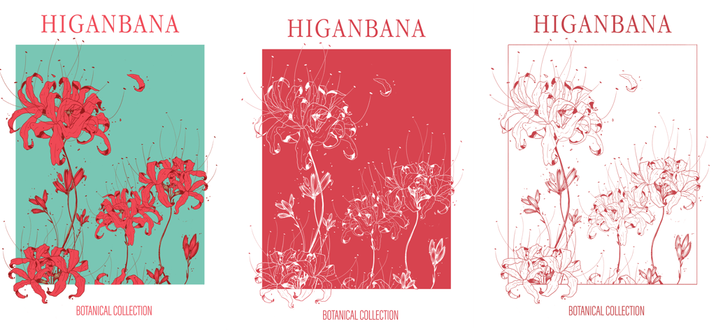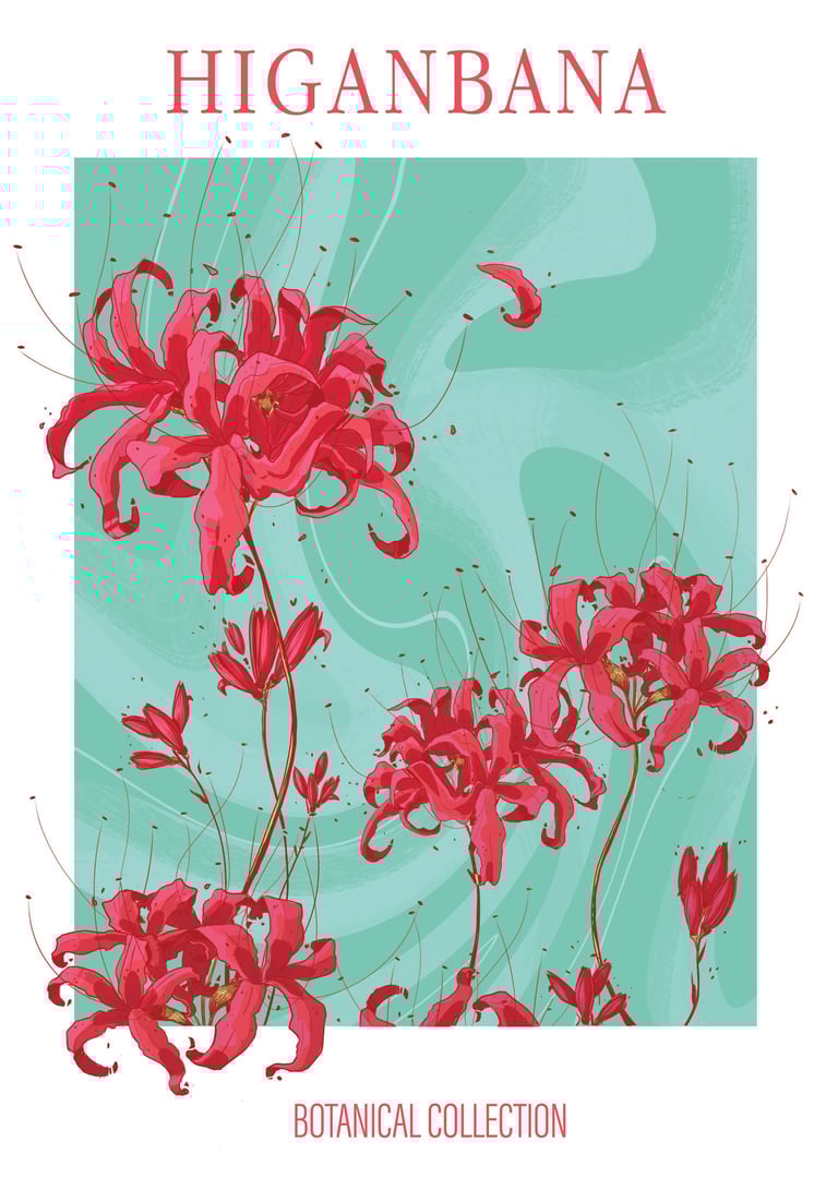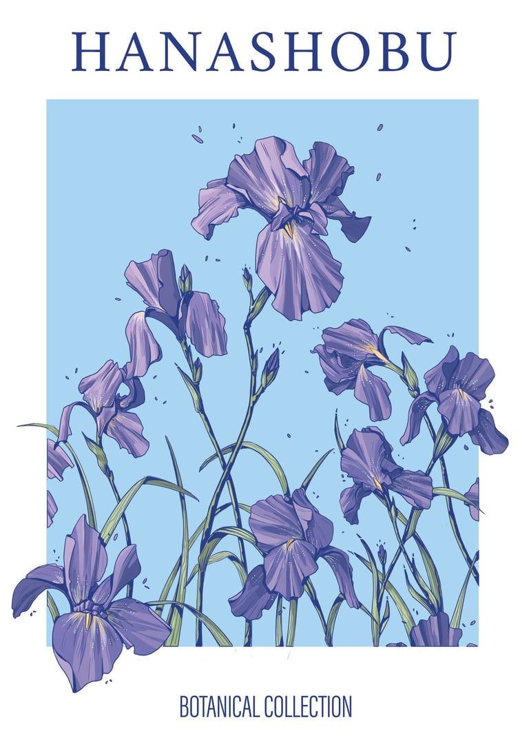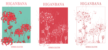 Affiches illustrant la beauté des fleurs japonaises, ici l' Higanbana ( red spider ) et l' Hanashobu ( iris ).